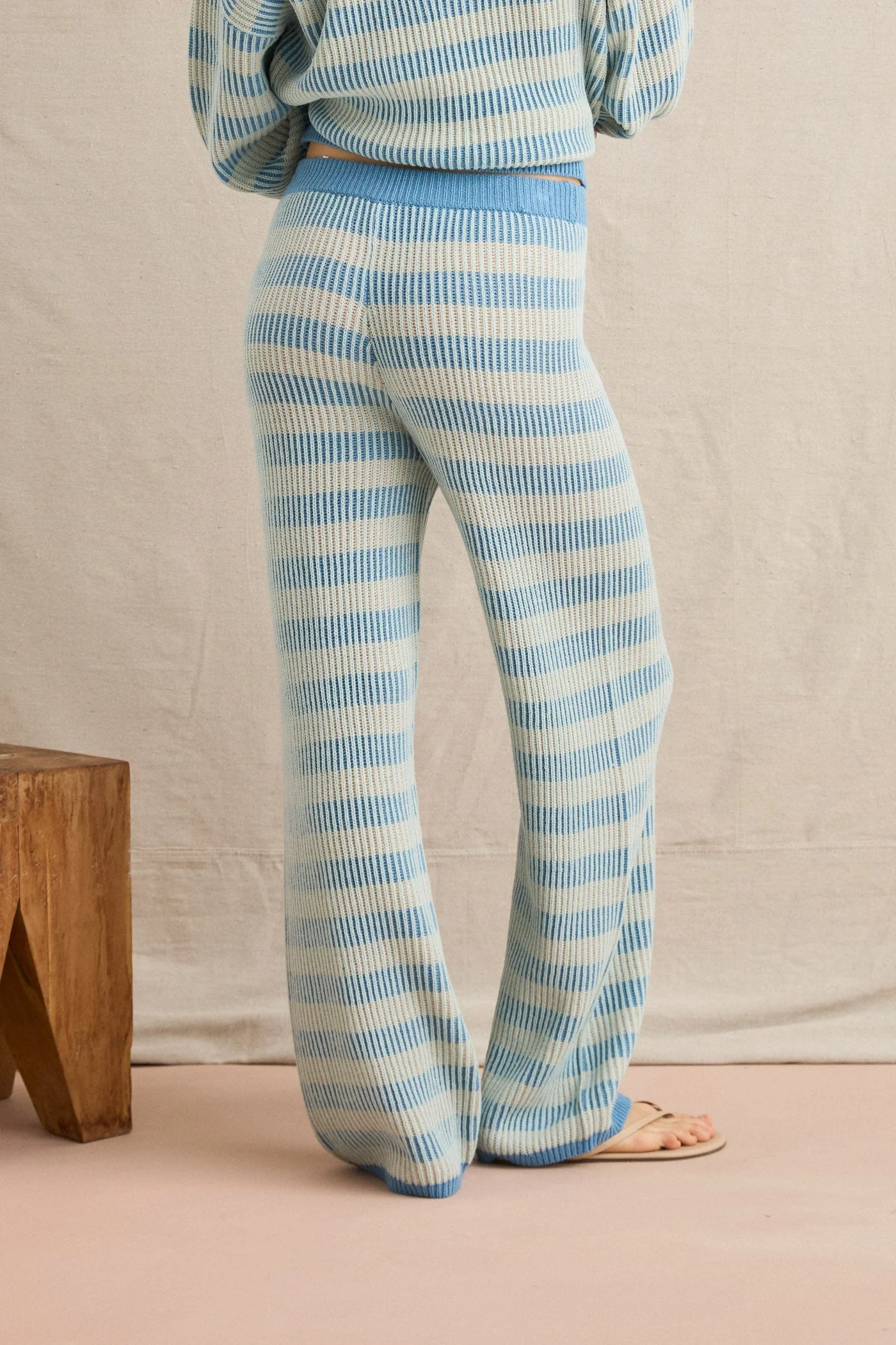 These relaxed-fit pants showcase a multi-color striped rib knit pattern and an elastic waistband for comfort. Perfect for casual wear or lounging.