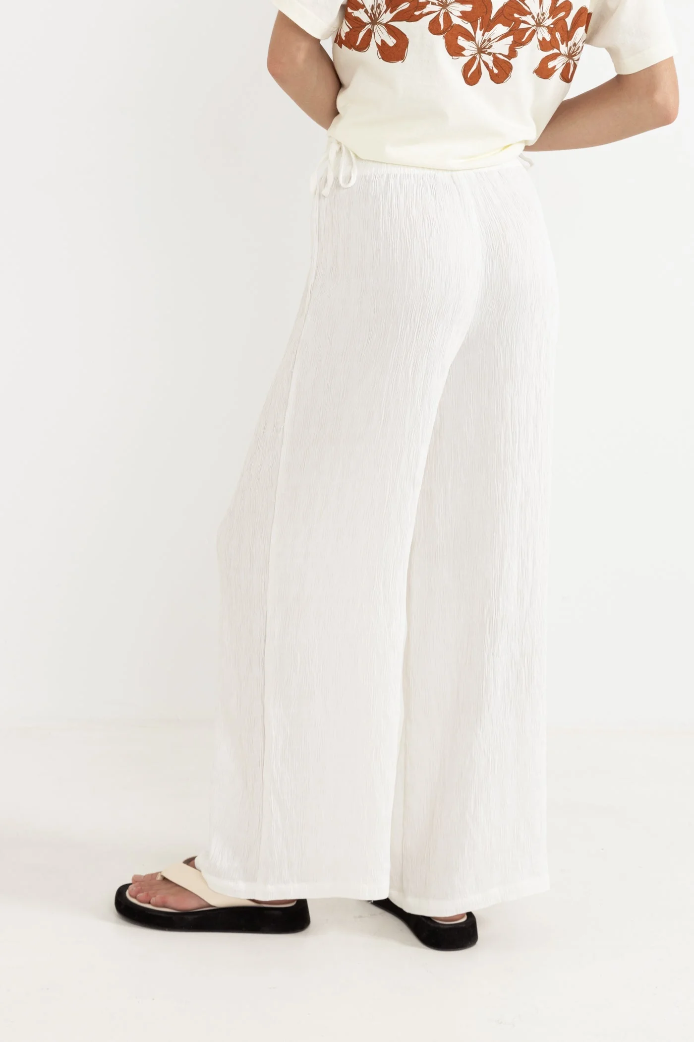Relaxed yet stylish, these pants are made from a slightly crinkled textured fabric with an elastic waistband and tie side details. The slightly sheer fabric adds an effortless touch to your laid-back look.