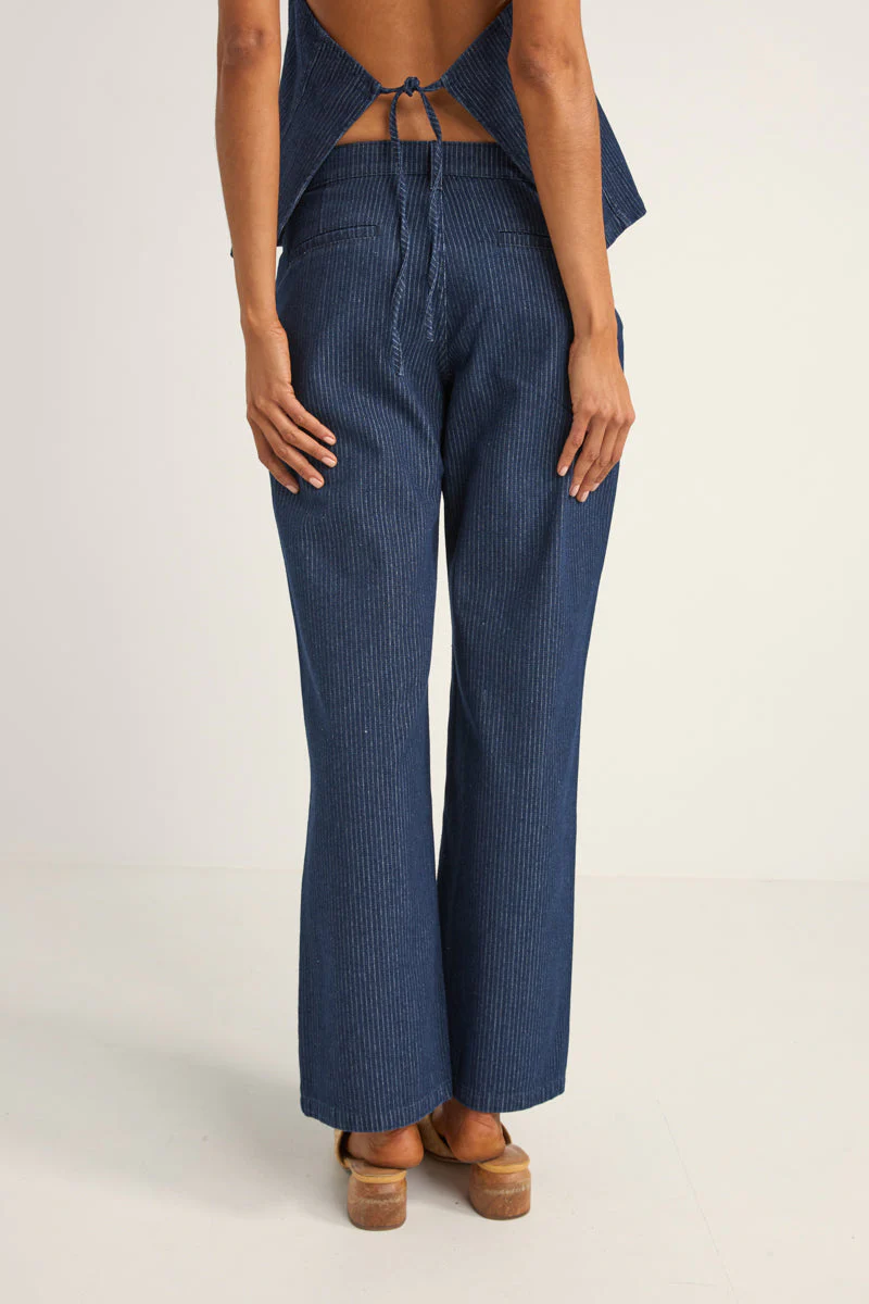 The Pinstripe Mid-Rise Pant offers a classic fit with a straight leg and subtle pinstripes. Ideal for both relaxed and polished looks, it's a versatile wardrobe staple.